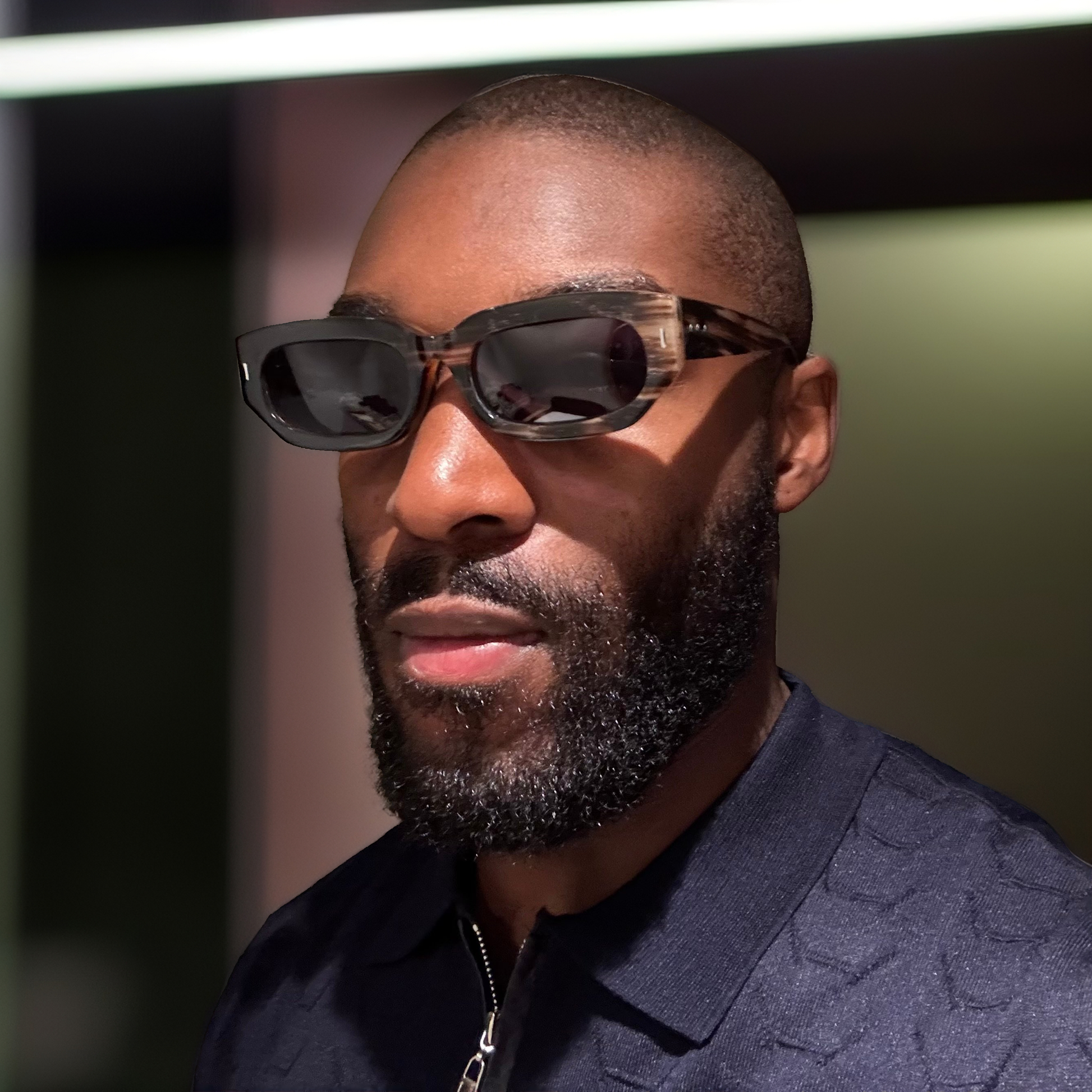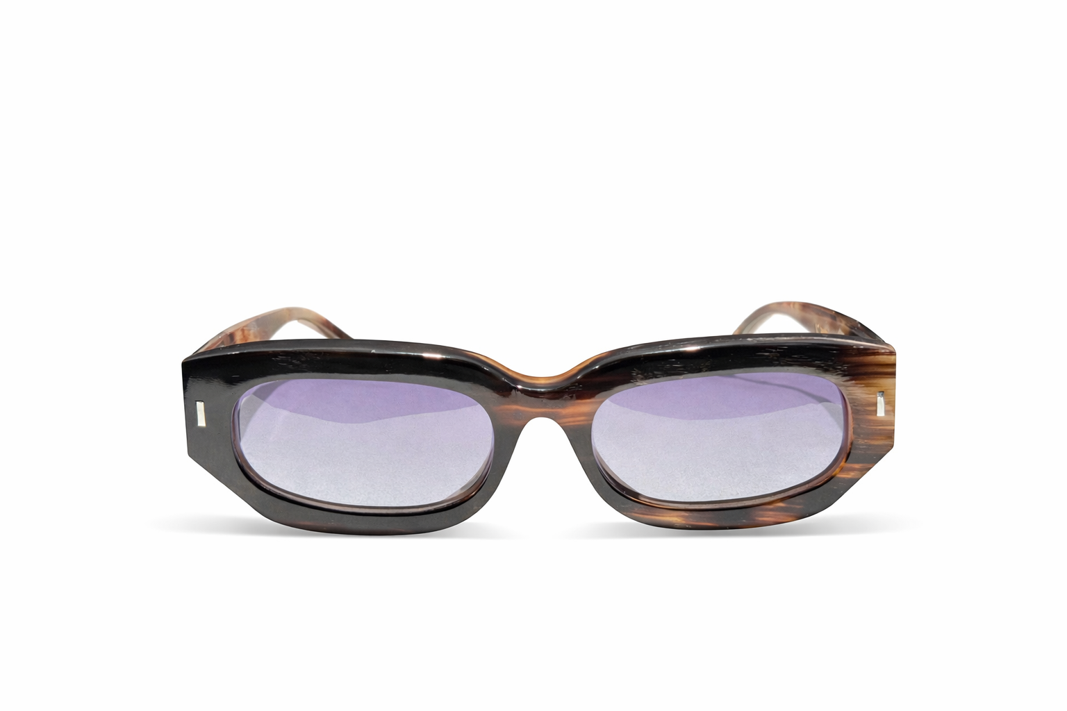 • Frame in selected natural horn — alternating dark and light shades, hand-marbled