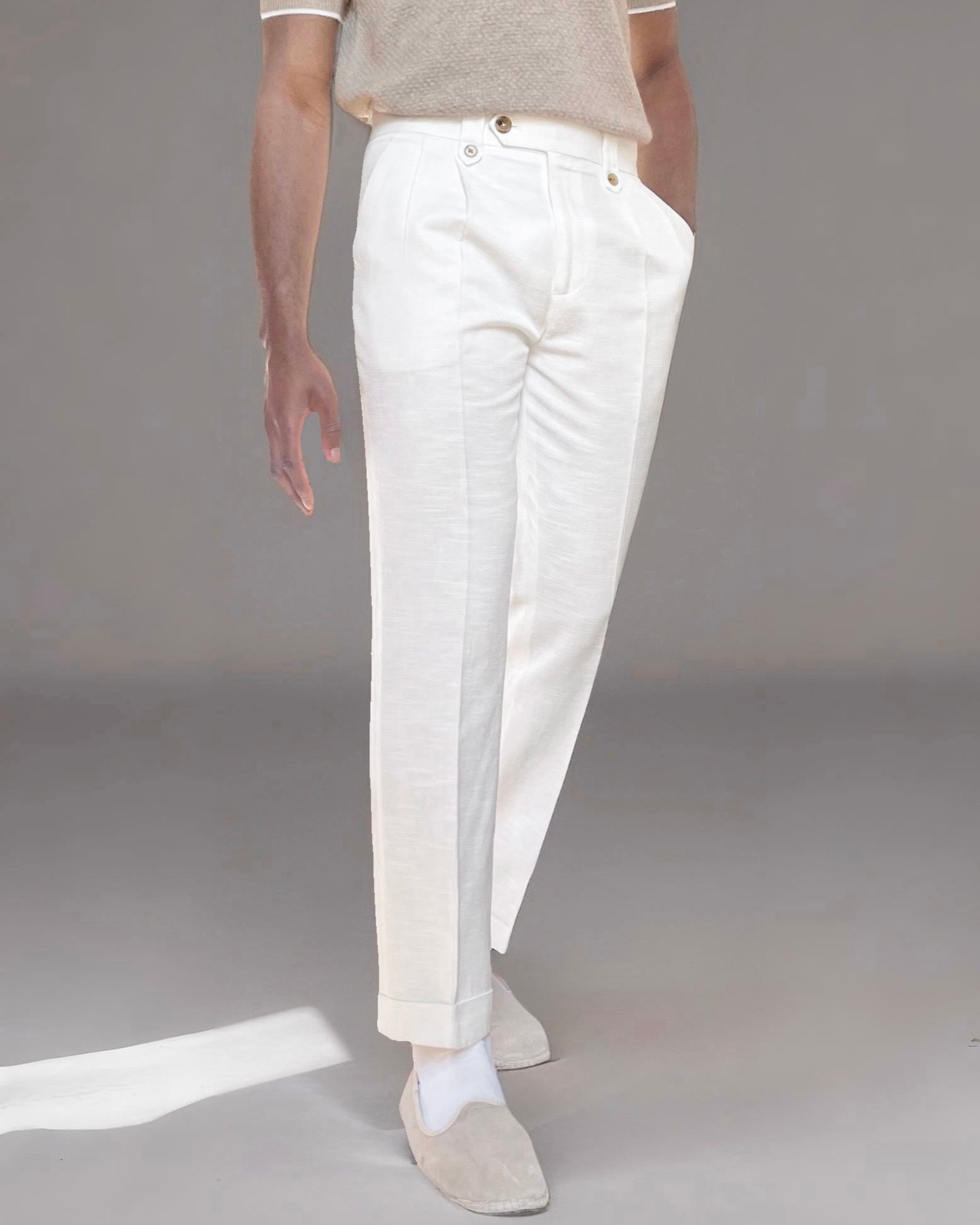 Ce pantalon incarne l’élégance fluide des beaux jours à travers une coupe impeccable et des matières nobles à la texture vivante. La teinte ivoire minéral, subtilement texturée, s’inspire des tons naturels de la craie, du sable clair et du calcaire patiné par le temps. Léger, respirant et naturellement lumineux, il accompagne les mouvements avec souplesse, pour une silhouette à la fois structurée et décontractée. Une pièce essentielle du vestiaire estival raffiné.