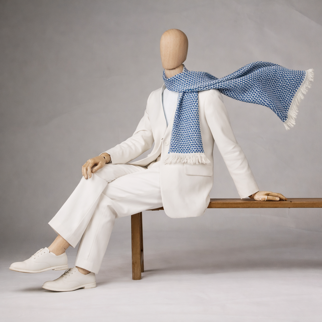 Tissée avec soin, cette écharpe offre un porté intuitif et naturel. Sa texture graphique subtile met en valeur la richesse de la matière et la profondeur de la couleur.